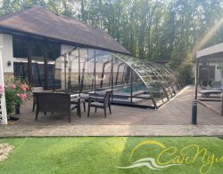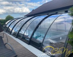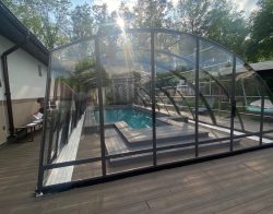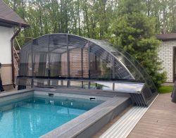 В 2025 году специалисты нашей компании установили телескопический павильон РАВЕНА с секциями из монолитного поликарбоната, цвет профиля Антрацит. Размер павильона 4,5х12,8м высотой 2,4м. Направляющие павильона продлены за чашу бассейна для полного открытия зеркала воды. Чаша бассейна отделана пленкой ПВХ Cefil (Испания) в цвете Гранит текстурный.